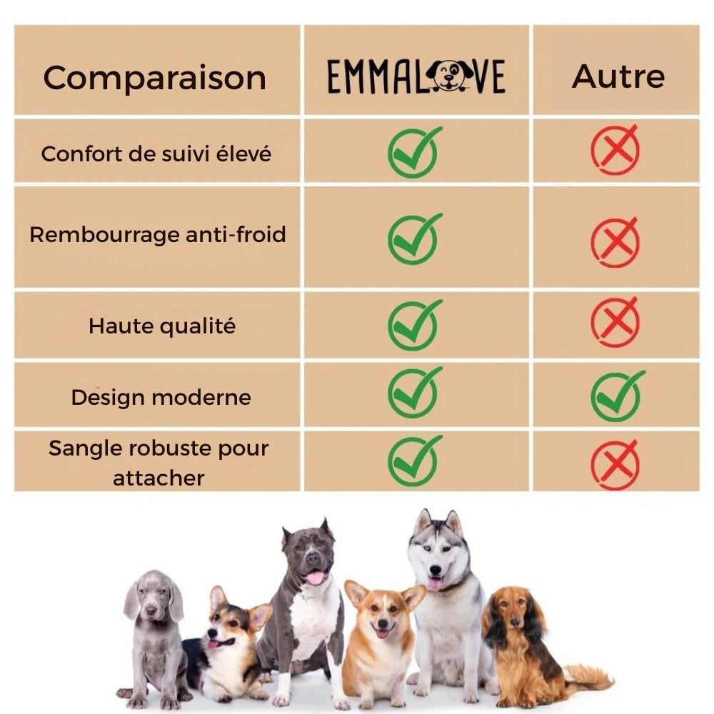 Nous avons mis au point ce manteau pour chien pendant plusieurs mois, avec notre chienne Emma comme testeuse. Ce faisant, nous avons veillé à prendre en compte tous les éléments essentiels à un confort optimal.